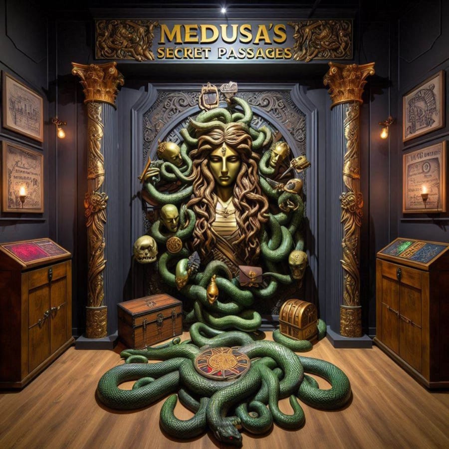Uncover the mystery of Medusa's Secret Passages, an exhilarating escape room experience that will leave you on the edge of your seat. Dive into the depths of the dried-out underwater city and face the wrath of Medusa herself. Can you outsmart the mythical creature and escape her curse?